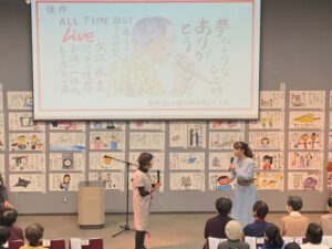 司会の桑原しおりさんのほっこりモードによるインタビューにより、推しの歌手への感謝の気持ちを描いた73歳の女性が、実際のライブの様子を語ってくださったり、6歳の息子に対する絵てがみを描いた40歳の男性からは、筆の里工房での絵てがみ展を見て、絵てがみを描くようになったとのお話があったりなど、楽しい交流会となりました。
